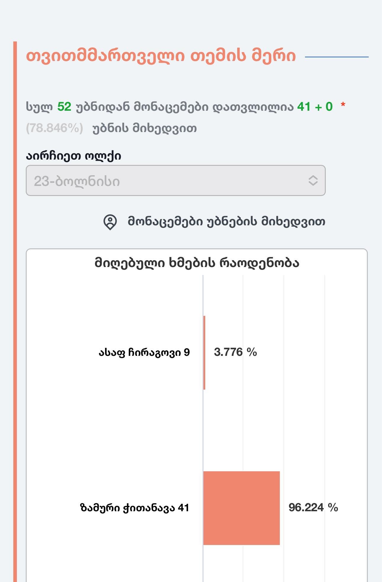 ცენტრალური საარჩევნო კომისიის წინასწარი მონაცემებით უკვე დათვლილია ბოლნისის მუნიციპალიტეტის 52 უბნიდან 41 უბანზე მეტის შედეგები.